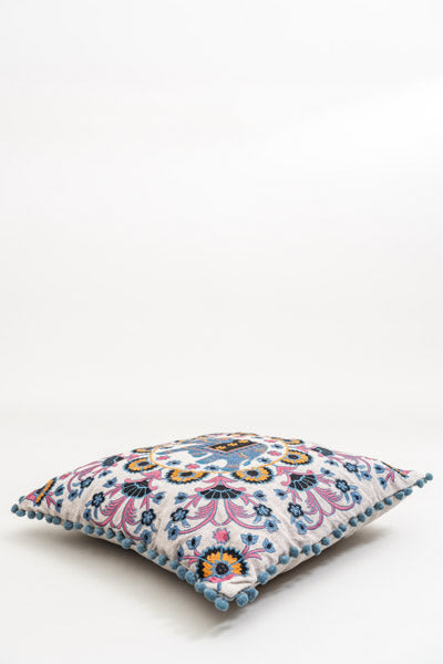 Elegante Kissenhülle aus Baumwolle mit Blumenmuster in Blau und Beige.