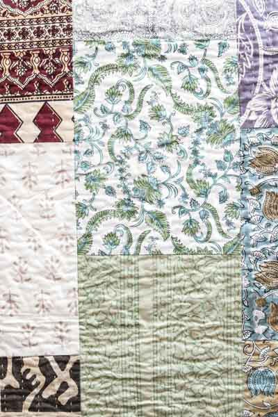 Mehrfarbige Kissenhülle aus Baumwolle mit Streifen in Beige, Gelb, Grün und Rosa.