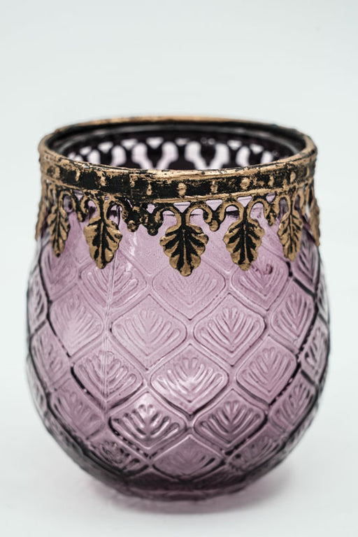Grosses Windlicht aus lilafarbenem Glas. Ausdrucksstark und dekorativ.