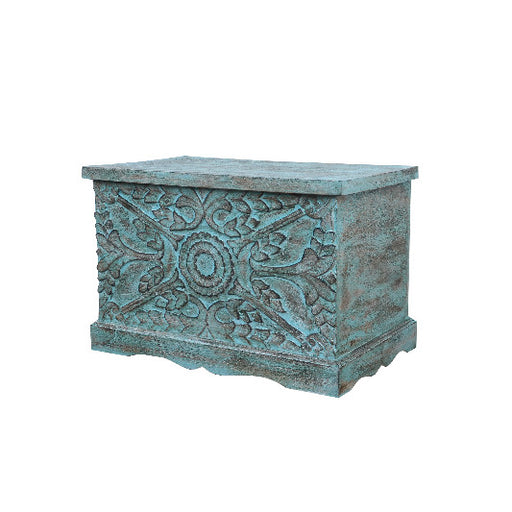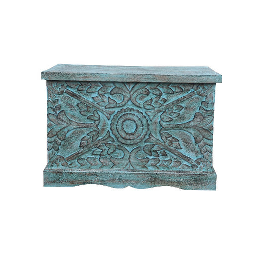 Handgemachte Truhe aus geschnitztem Mangoholz, gefertigt in Indien. Maße: 71×44×47 cm. Einzigartiges Design mit kunstvollen Details – ideal als sti...