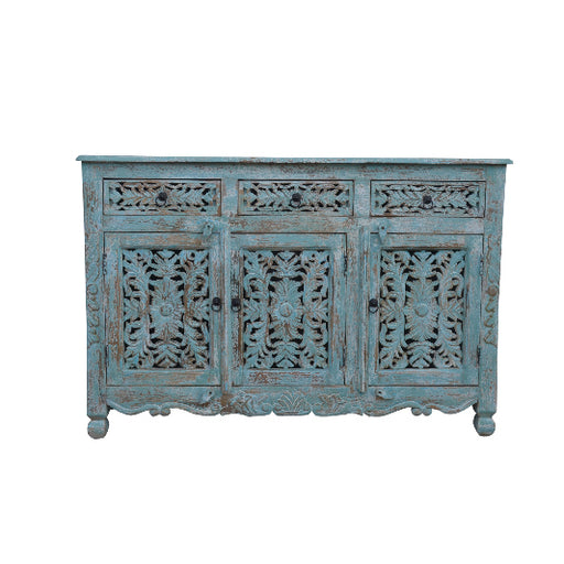 Massives Sideboard aus Mangoholz mit 3 geschnitzen Schubladen und 3 geschnitzen Türen. Maße: 135×42×90 cm. Handgefertigt in Indien – bietet großzüg...