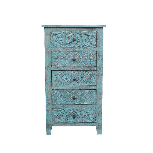 Handgefertigte Kommode aus massivem Mangoholz mit 5 geschnitzten Schubladen. Maße: 50×40×90 cm. Kompaktes Design mit natürlicher Holzmaserung – ide...