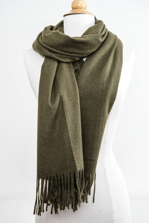 Olivegrüner Schal aus Kaschmir, Viskose und Wolle. Masse: 70×190 cml – natürlich & weich: Warmer Farbton mit edlem Materialmix.