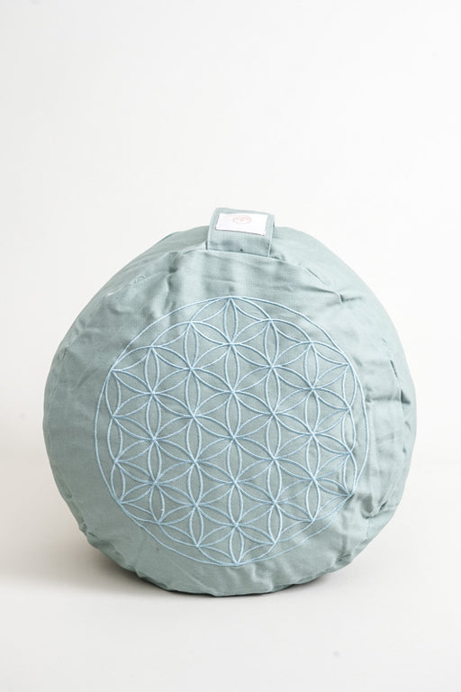 Rundes Meditationskissen in Salbeigrün mit Lebensblume – für achtsame Momente. Ideal für Yoga, Meditation und Entspannung. // Der Bezug der Kissen ...