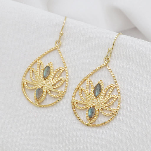 Vergoldete Ohrringe mit Lotusblume und Labradorit – spirituell und stilvoll