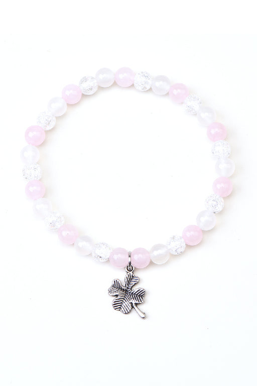 Armband 6mm Rosenquarz / Kristallquarz / weisser Achat 18.5cm, mit Anhänger Kleeblatt