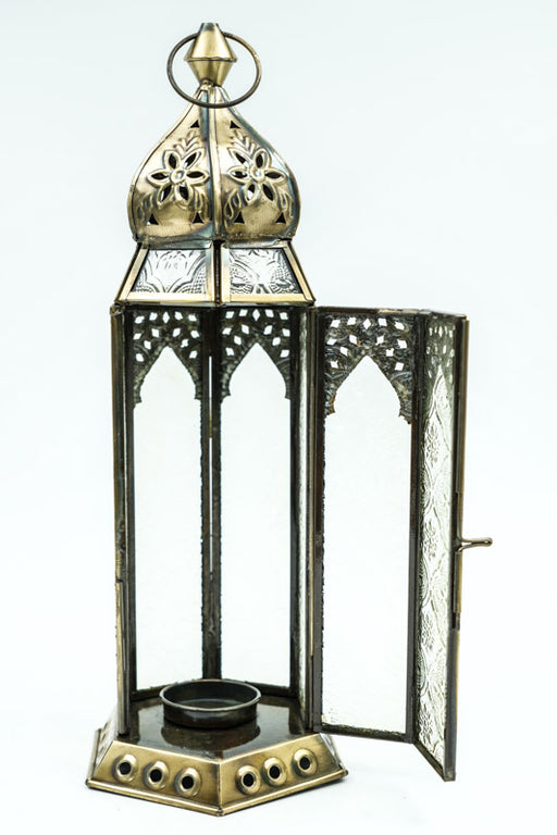 Hexagonal lantern made of brass with clear glass – simple & elegant: ideal for tea lights or small candles.
