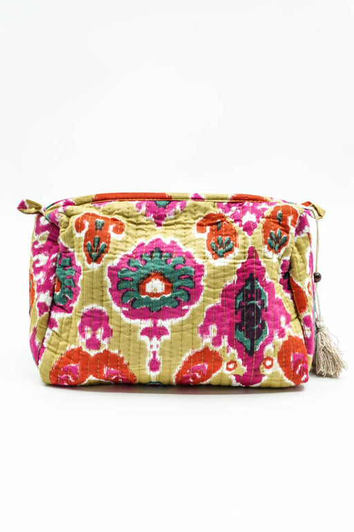 Spacious cosmetic bag with a colorful design.