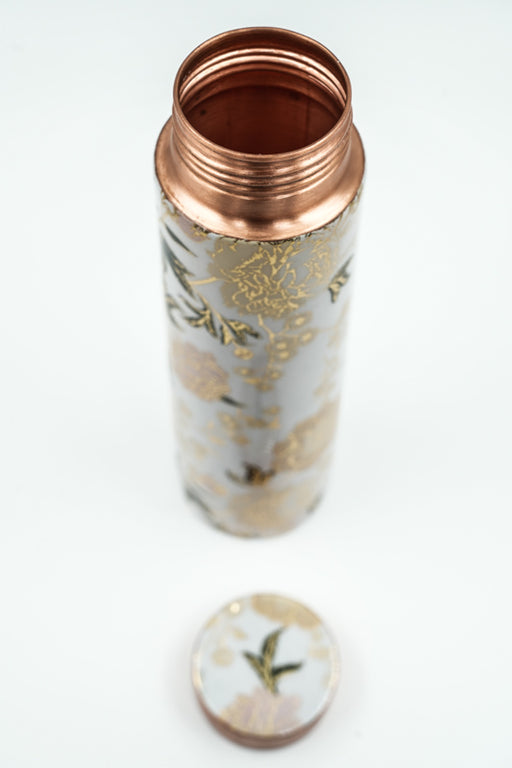 Copper bottle with a floral pattern in beige and green. For subtle color accents – let the water stand overnight in the Ayurvedic copper bottle and...