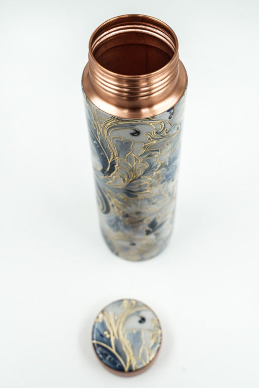 Copper bottle with a decorative pattern in blue and beige. For a modern aesthetic – let the water stand overnight in the Ayurvedic copper bottle an...