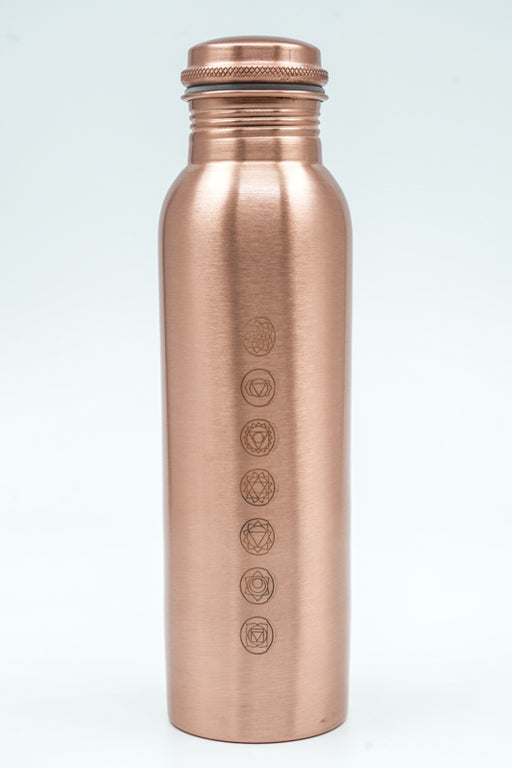 Matte copper bottle with 7 chakra symbols. For spiritual balance and energy – let water stand in the Ayurvedic copper bottle overnight and drink it...