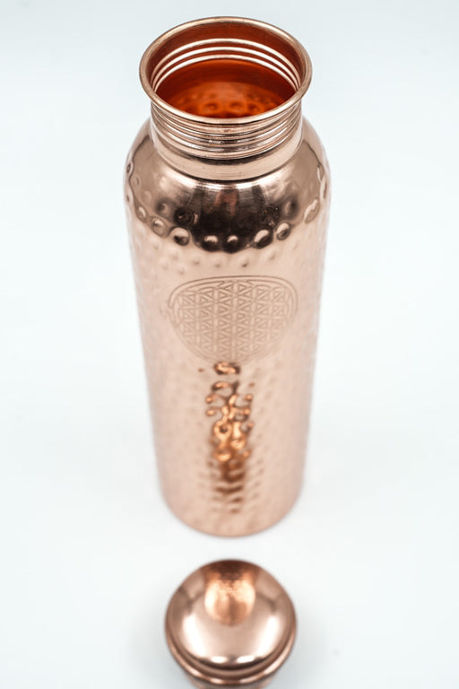 Hammered copper bottle with the 'Flower of Life' symbol. For energizing drinking – leave the water in the Ayurvedic copper bottle overnight and dri...