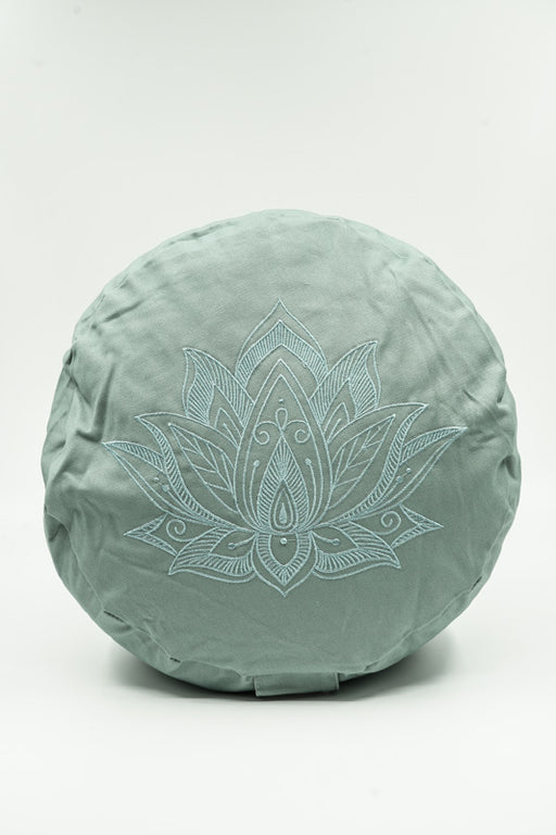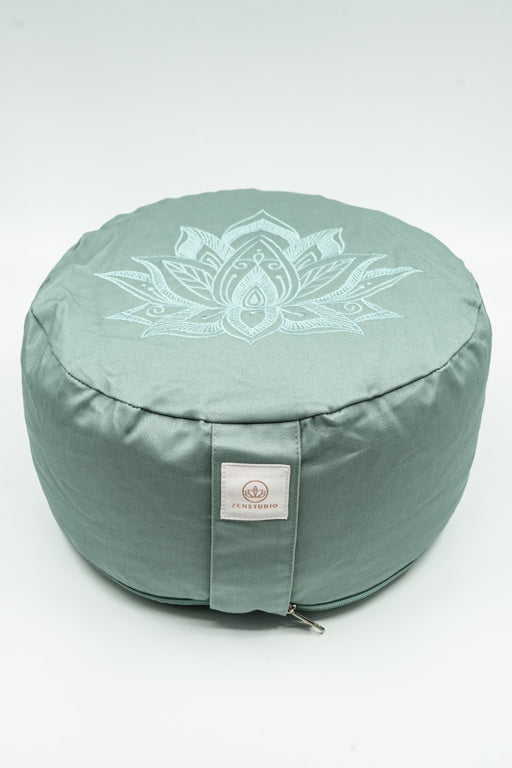 Sage green meditation cushion with lotus flower – round and soothing. For meditative depth and balance. // The cushion cover, with its practical ca...