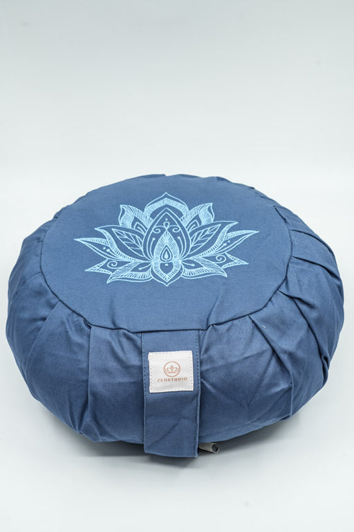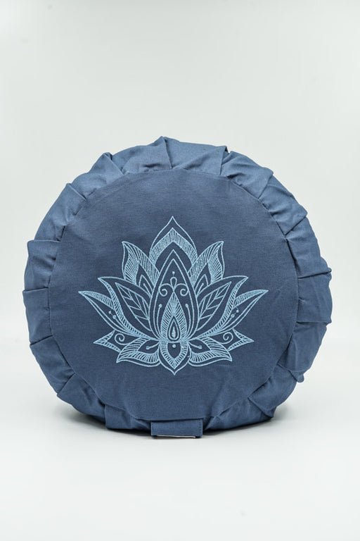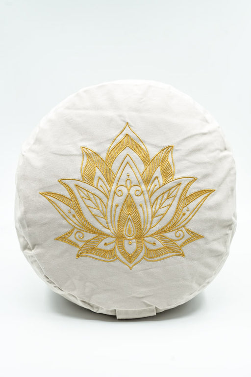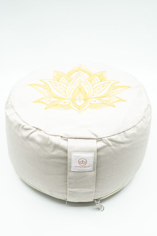 Beige meditation cushion with lotus flower – round and inspiring. For spiritual practice and comfort. // The cushion cover, with its practical carr...