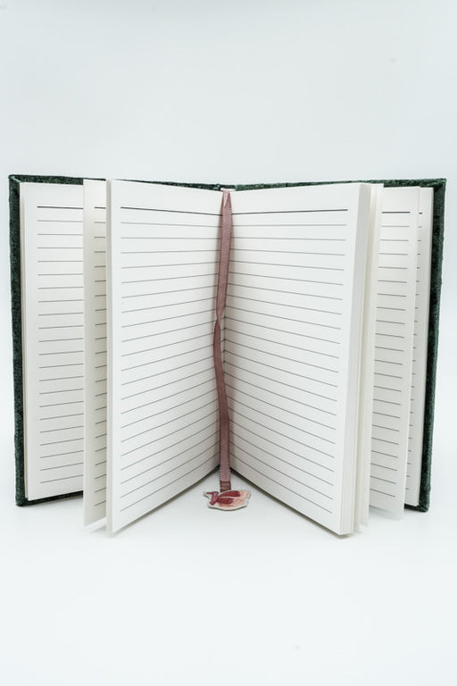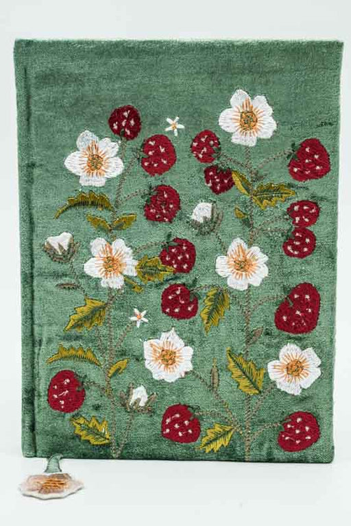 A playful notebook with floral and strawberry motifs on a green background. A refreshing companion for your ideas, recipes, or gardening plans.