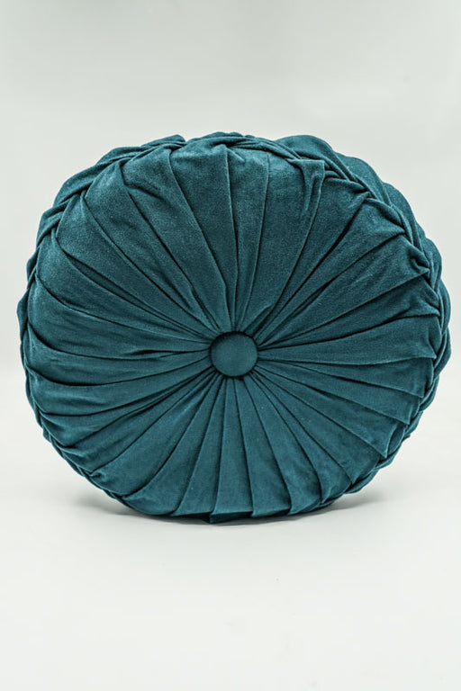 Coussin rond en velours bleu sarcelle – moderne et doux – couleur vive avec un toucher velouté.