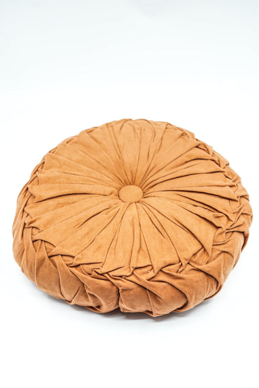 Coussin rond en velours marron clair – doux et neutre – ton naturel pour un ameublement cosy.