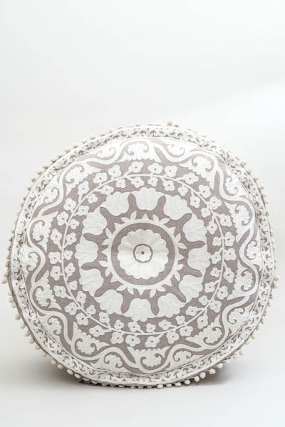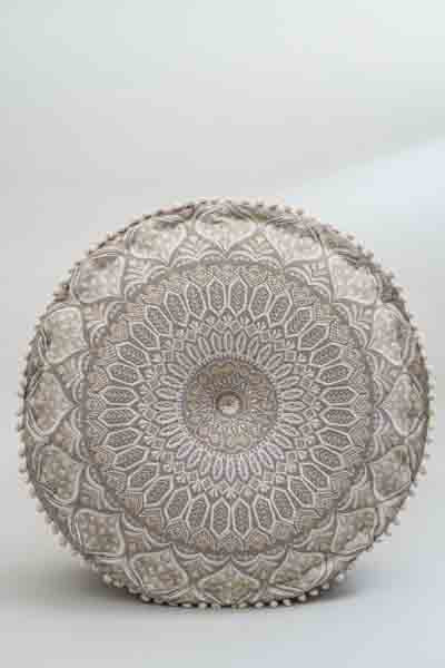 Le pouf, avec sa broderie mandala filigrane, allie élégance et sérénité. Son design harmonieux s'intègre parfaitement aux styles d'intérieur modern...