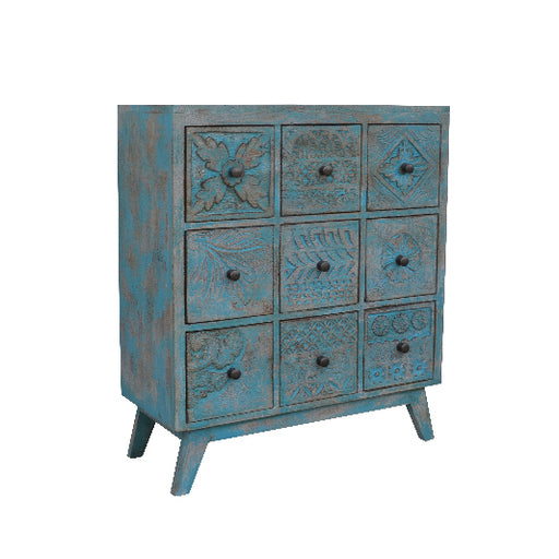 Praktische Kommode aus massivem Mangoholz mit 9 geschnitzten Schubladen, handgemacht in Indien. Maße: 76×33×87 cm. Authentisches Design mit viel St...