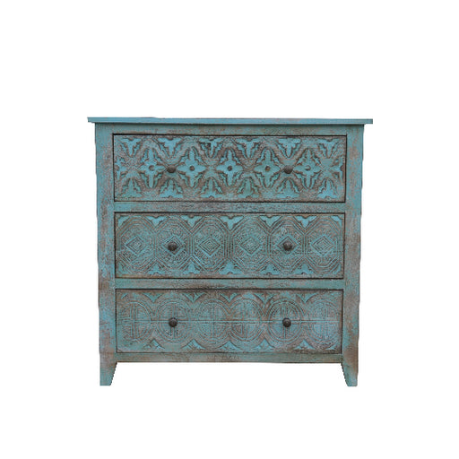 Massive Kommode aus Mangoholz mit 3 geräumigen, geschnitzten Schubladen. Maße: 81×40×80 cm. Handgefertigt mit natürlicher Holzmaserung – ein stilvo...