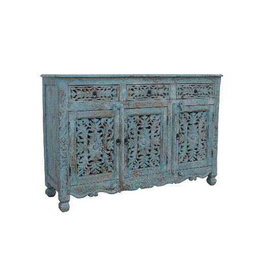 Massives Sideboard aus Mangoholz mit 3 geschnitzen Schubladen und 3 geschnitzen Türen. Maße: 135×42×90 cm. Handgefertigt in Indien – bietet großzüg...