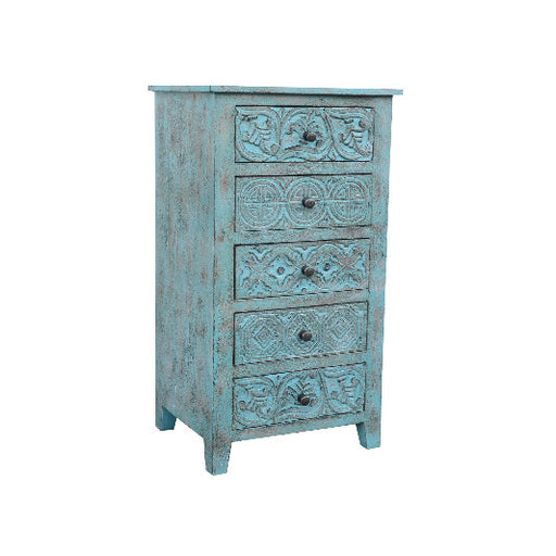 Handgefertigte Kommode aus massivem Mangoholz mit 5 geschnitzten Schubladen. Maße: 50×40×90 cm. Kompaktes Design mit natürlicher Holzmaserung – ide...